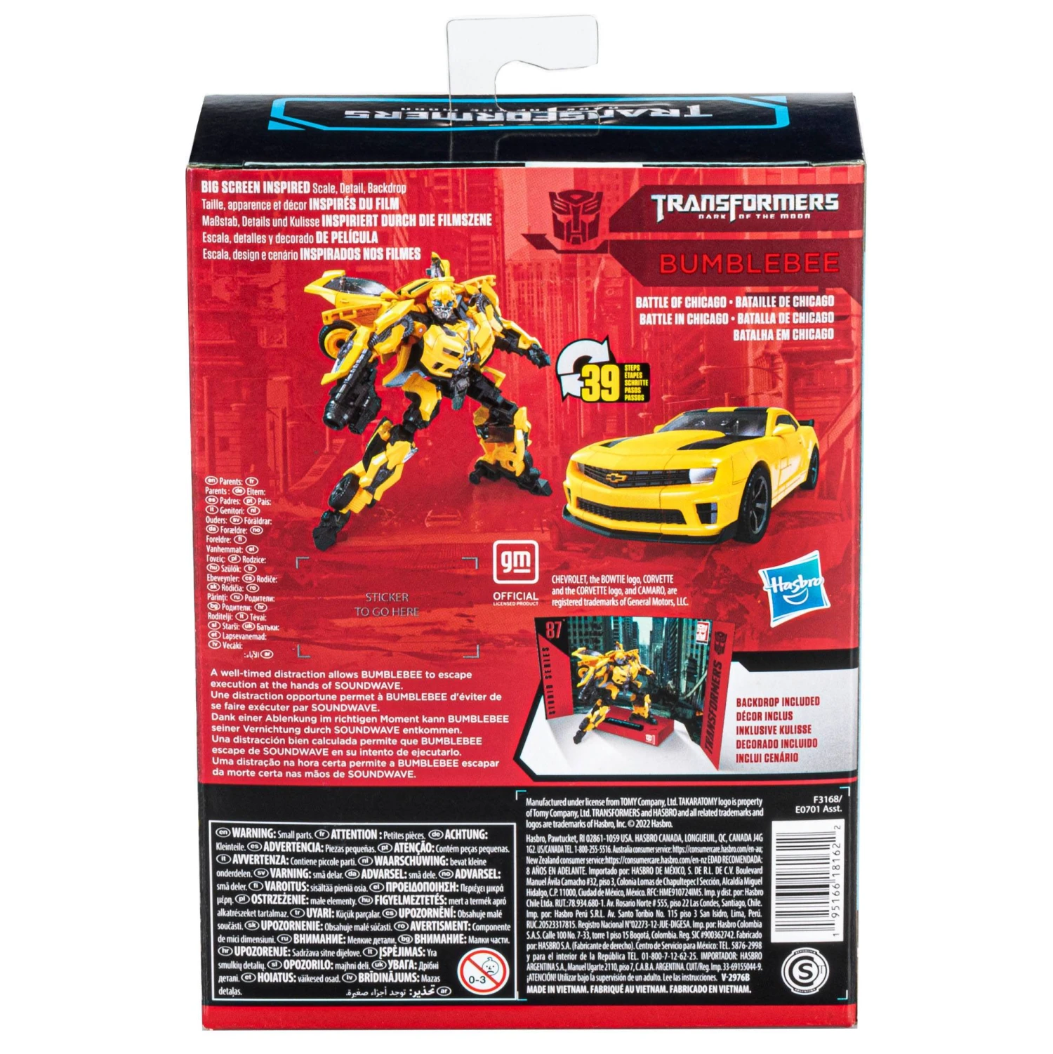 This Studio Series 87 Deluxe Class Transformers: Dark of the Moon -inspired Bumblebee figure converts from robot to licensed Camaro mode in 39 steps. Remove backdrop to showcase Bumblebee in the Battle of Chicago scene. In the Battle of Chicago scene from Transformers: Dark of the Moon, a well-timed distraction allows Bumblebee to escape execution at the hands of Soundwave. Pose the figure out with the included blaster accessory and imagine re-creating this classic movie moment!