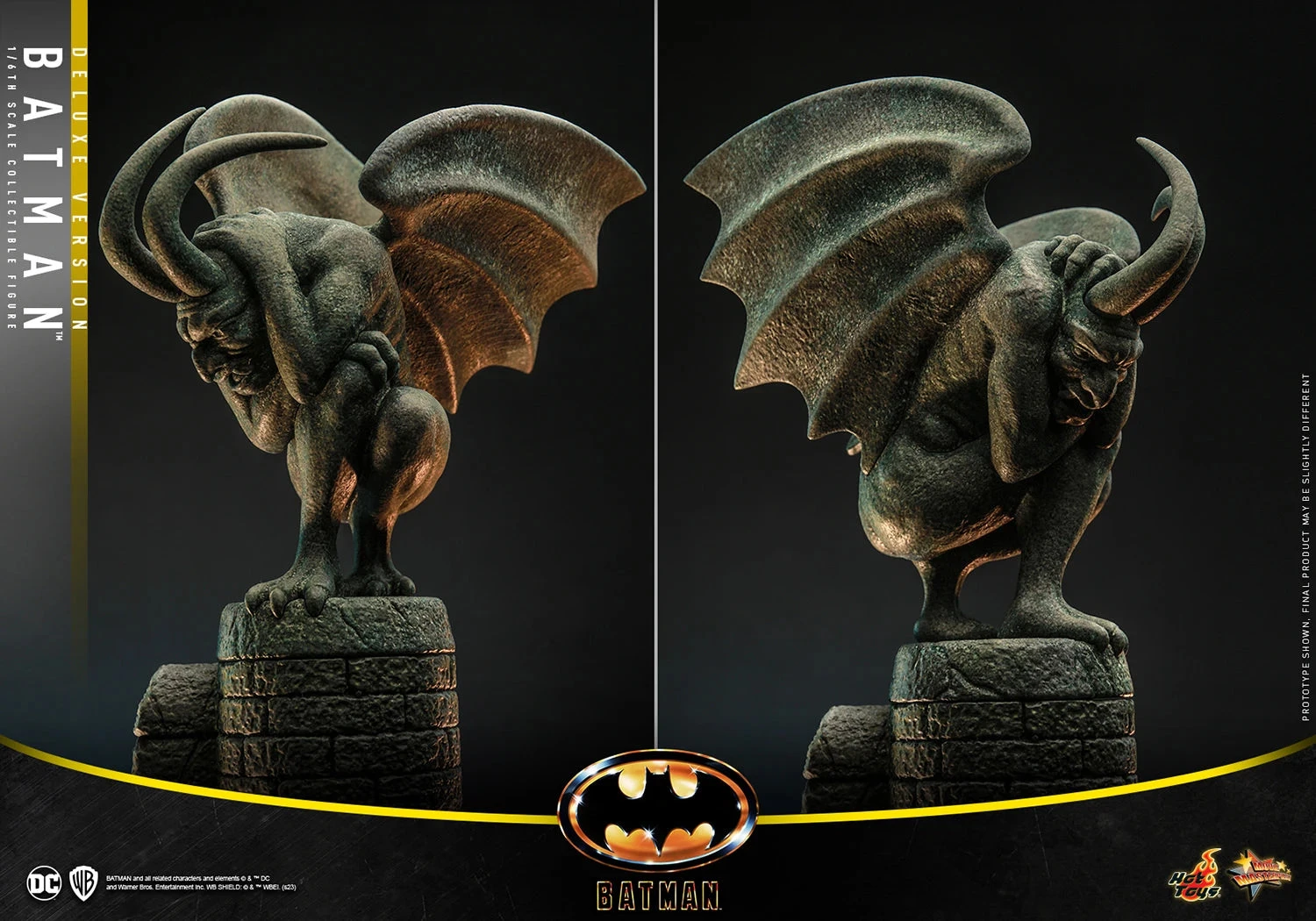 The Deluxe Version offers a highly-detailed diorama base, showing a corner of the ruined church roof with a spinnable sculpted statue also stones in incredible texture and detail, which allows fans to revisit the scene with Batman standing perched on the edge of the roof.