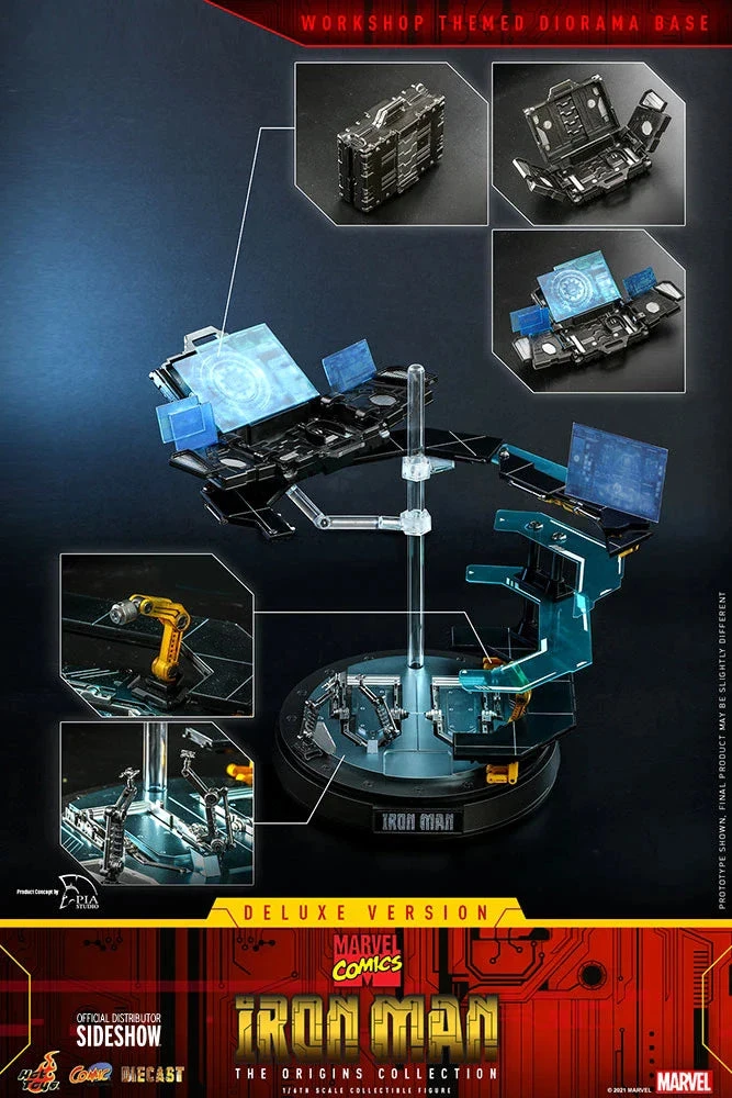 The deluxe version includes a signature Iron Man suitcase with articulated function, also an elaborated diorama figure base with LED light-up function, allowing fans to explore Tony Stark’s high-tech workshop straight from the comic pages, includes articulated gantry arms, extra armour parts, and holographic screen accessories.