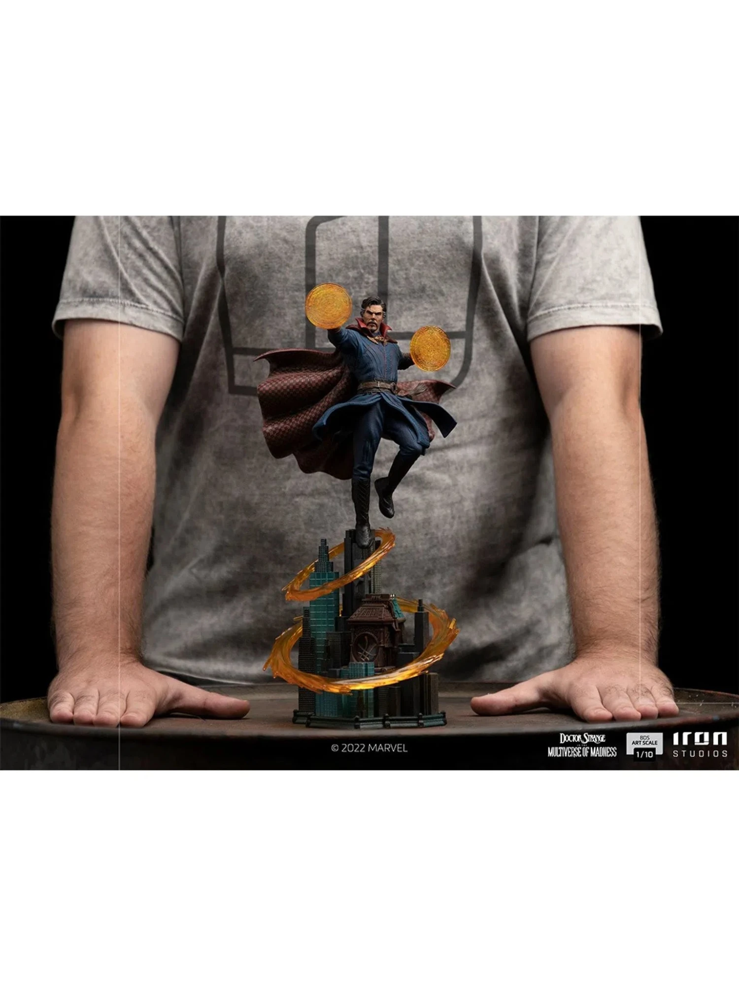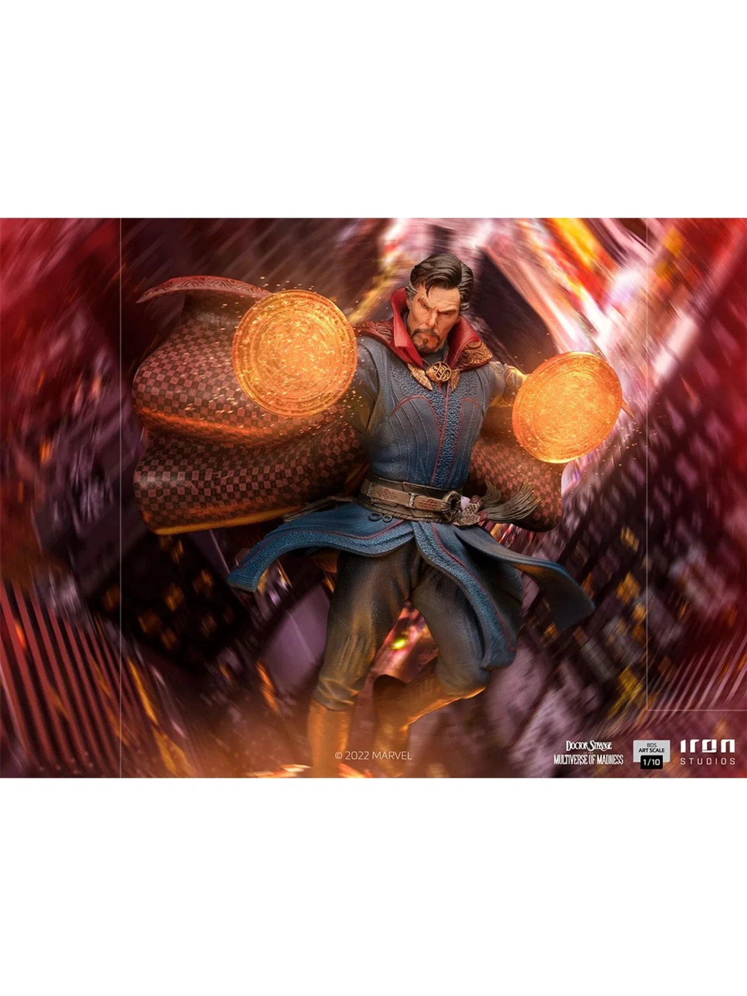 Mystic energy beams encompass New York city as dimensional portals of a multiverse, above where his house and base of operations are. In a magic mansion, known as the Sanctum Sanctorum, the Sorcerer Supreme hovers levitating with the aid of his sentient Cloak of Levitation and casts spells that manifest as translucent mandalas from his hands. As if they were crossing those portals, Iron Studios present their statue “Stephen Strange BDS – Doctor Strange in the Multiverse of Madness – Art Scale 1/10”, inspired by the second movie of Marvel’s most loved sorcerer.