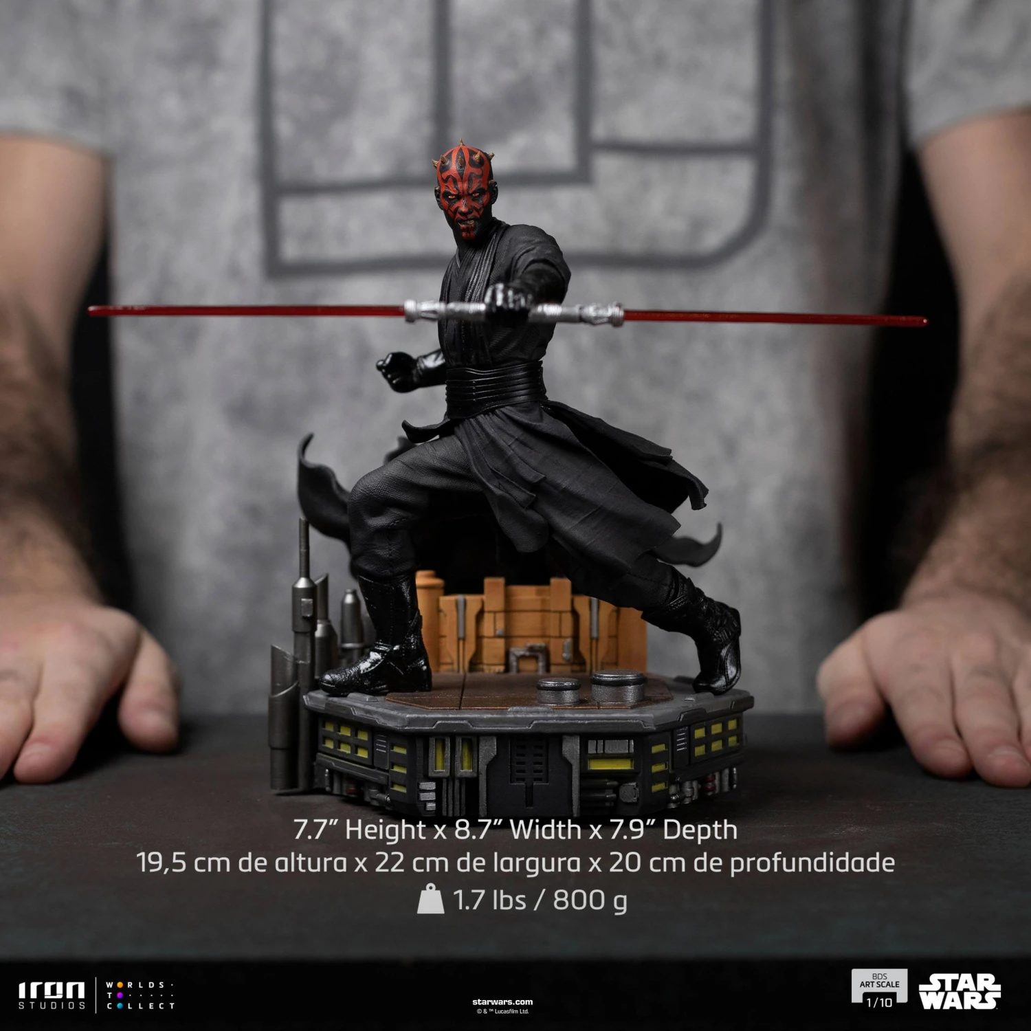 In the Palace of Theed on planet Naboo, the dark Dathomirian Sith warrior with all his skills uses Form VII, also known as Juyo, described as the cruelest combat form with a lightsaber. Adding his knowledge and discipline as a master in Teräs Käsi, a deadly and mystic martial art known in the whole galaxy for its lethality, he became one of the most efficient and lethal assassins among the Sith Lords. Inspired by the iconic dueling scene from Star Wars: Episode I – The Phantom Menace, where he faces the Jedi master Qui-Gon Jinn and his Padawan apprentice Obi-Wan Kenobi with his double-bladed lightsaber, Iron Studios, now with their global license, present the statue “Darth Maul BDS – Star Wars – Art Scale 1/10”. Over a detailed diorama pedestal that refers to the technological scenery of the power plant in Naboo, his expressive facial features gnashing his teeth in fury, all the movement from his pose and textures in his suit are perfectly portrayed in this fantastic figure, that undoubtedly brings immediately to the mind of all the fans the music track Duel of the Fates by composer John Williams.