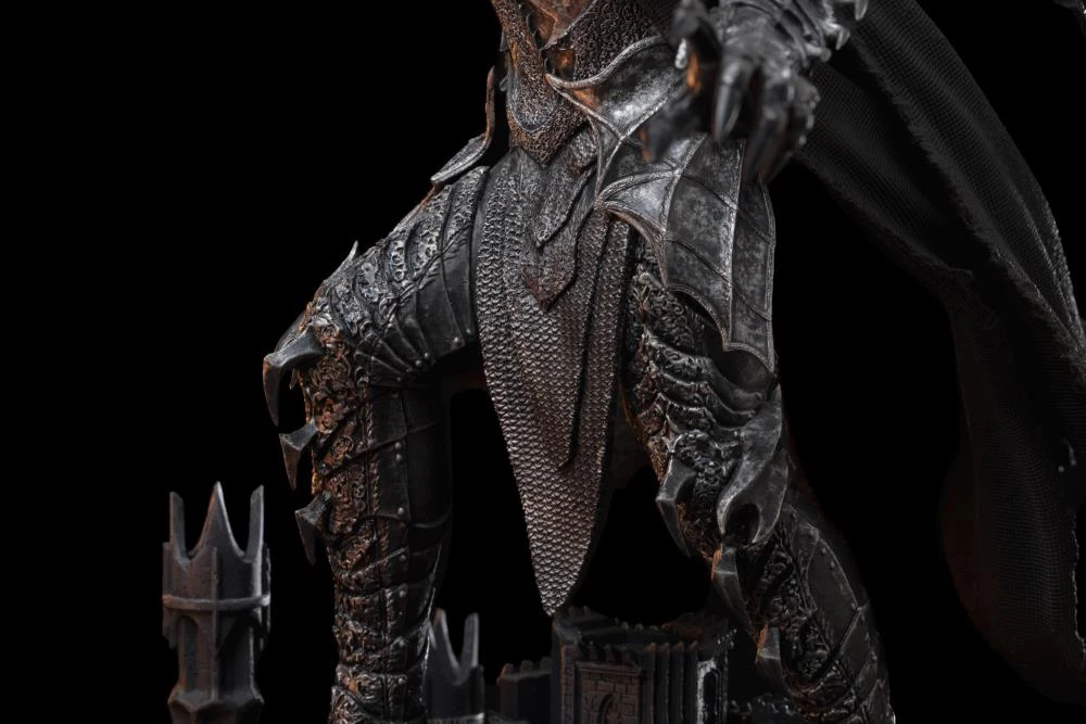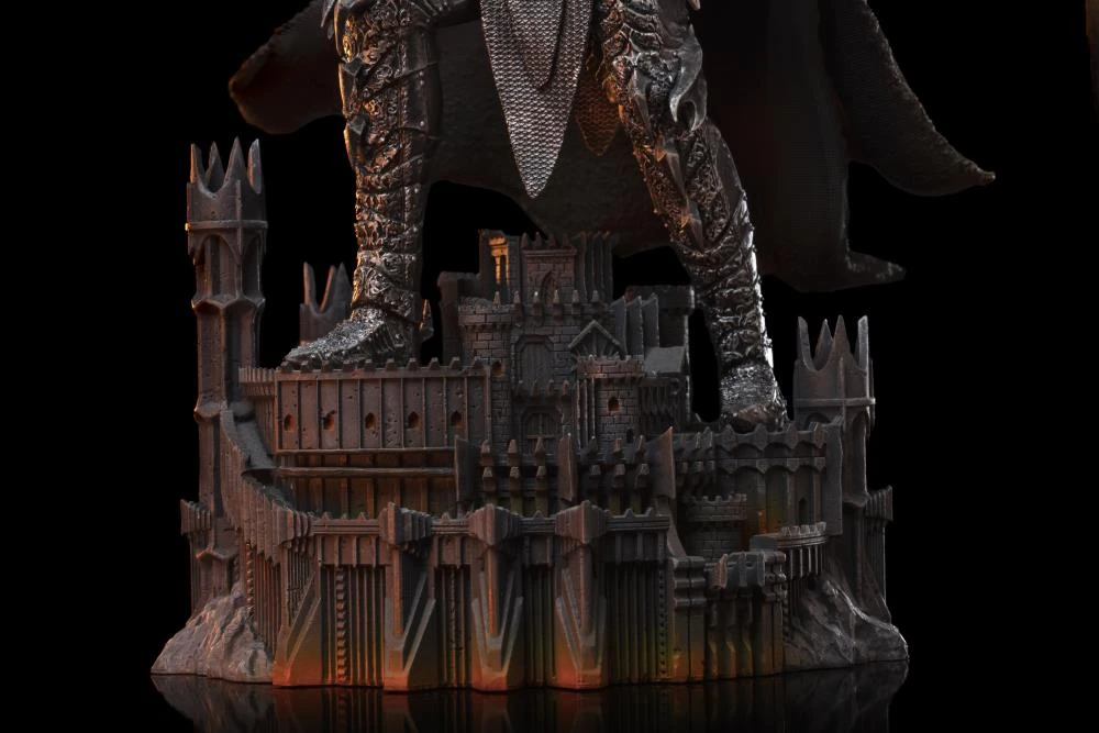 Wielding a giant iron war mace with six blades on top of his head, capable of killing dozens of men with only one strike, the fearsome Dark Lord reveals himself as if he was in the battleground. Wearing darkened steel armor similar to his old master Morgoth, worn to bind his spirit to his body, with his back covered by a rustic black cape and his face hidden by a sinister helmet with a crown of blades over his head. His imposing figure stands out on a diorama pedestal that replicates in detail his stronghold called Barad-dûr in Mordor, Middle-earth, his base of operations during the 2nd Age and the end of the 3rd Age. An entity whose mere presence causes fear in the heart of the bravest, Iron Studios bring the statue “Sauron Deluxe – The Lord of the Rings – Art Scale 1/10” with the main and most feared antagonist in the saga created by J.R.R. Tolkien, such as seen in the movie trilogy by director Peter Jackson.