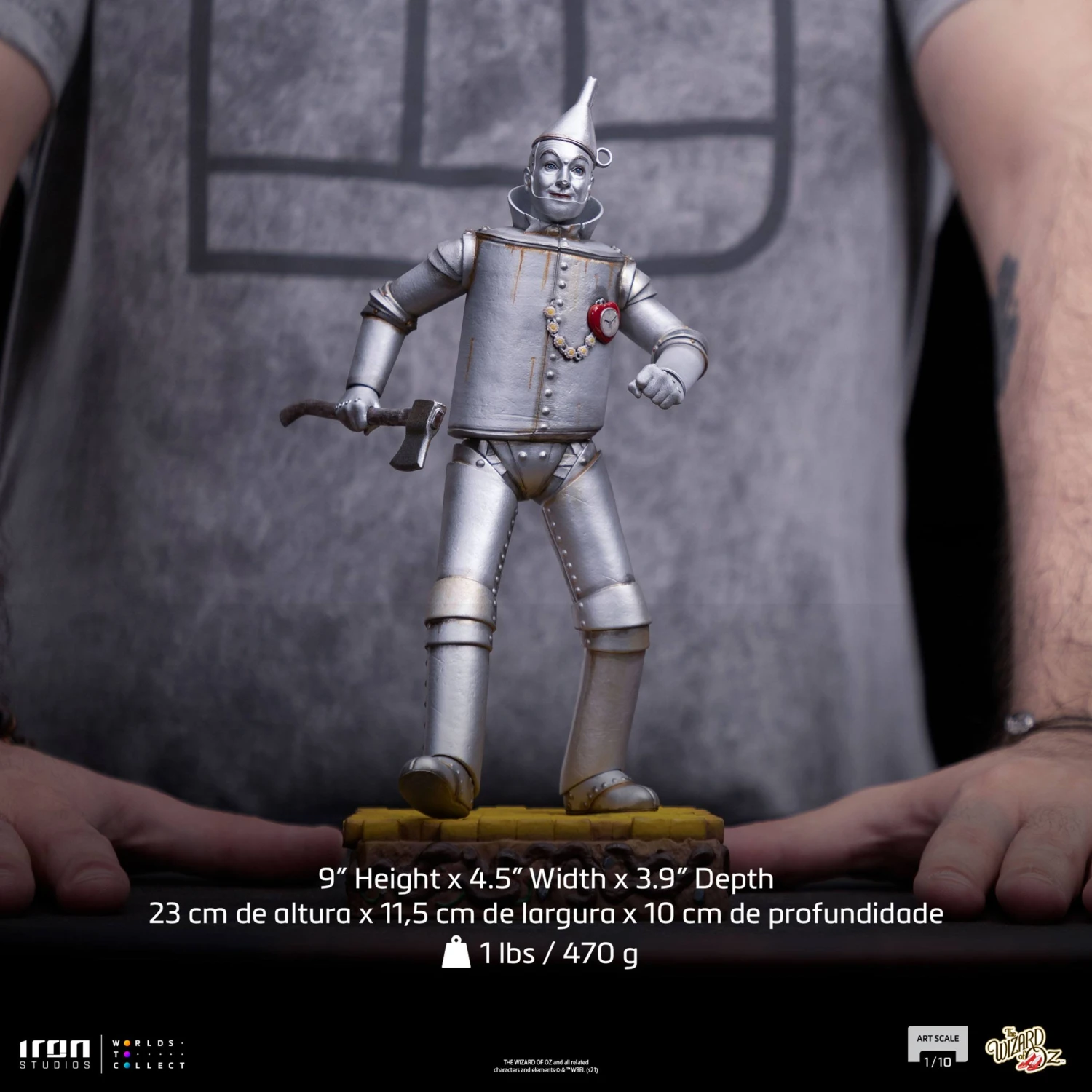 In the enchanted land of Oz, a brave girl discovers a mysterious metallic figure on the edge of the yellow brick road. Hidden by trees and bushes, a man entirely made of tin and completely rusted murmurs in agony for his oil can. After freeing him from his rust prison and helping him get back to moving and speaking, he tells her his sad story, that he felt empty inside because the Tinsmith that made his body forgot to add a heart. He then joins the young Dorothy in the search for the enigmatic wizard, that can help her get back to her home in Kansas, and maybe give a heart to her new friend. Iron Studios bring the statue of the classic “Tin Man – The Wizard of Oz – Art Scale 1/10”, played by Jack Haley, with his clock ticking on the left side of his chest, wielding his axe and walking over a pedestal of the yellow brick road.
