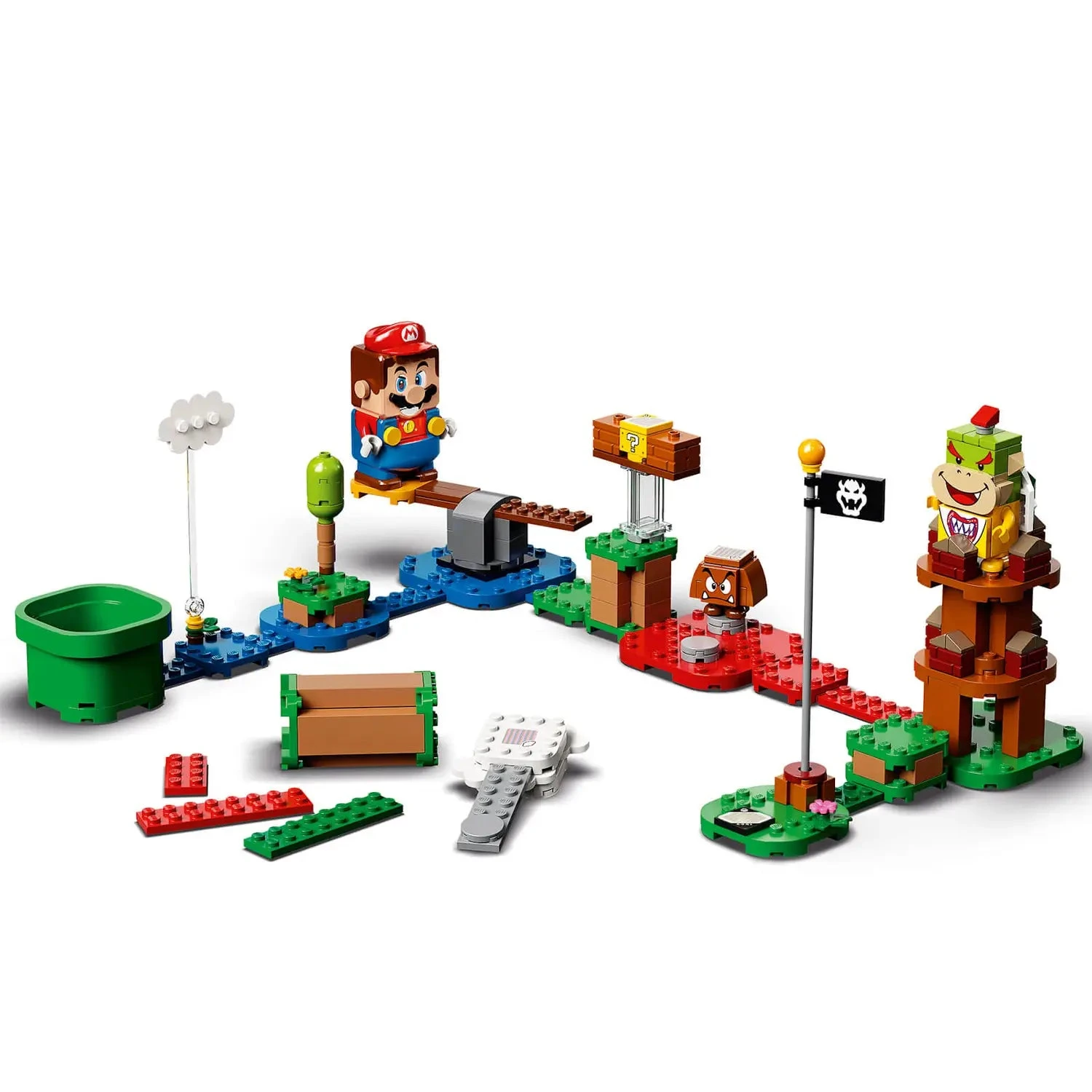 The set features a LEGO Mario™ figure that gives instant expressive responses via the LCD screens and speaker. Players earn virtual coins moving LEGO Mario from the Start Pipe to the Goal Pole via spinning and cloud platforms, the ? Block, and super battles with the Goomba and Bowser Jr. toy figures. Rearrange the bricks to create new levels to master. Kids can team up with their favorite character in the real world with this LEGO® Super Mario™ Adventures with Mario Starter Course (71360).