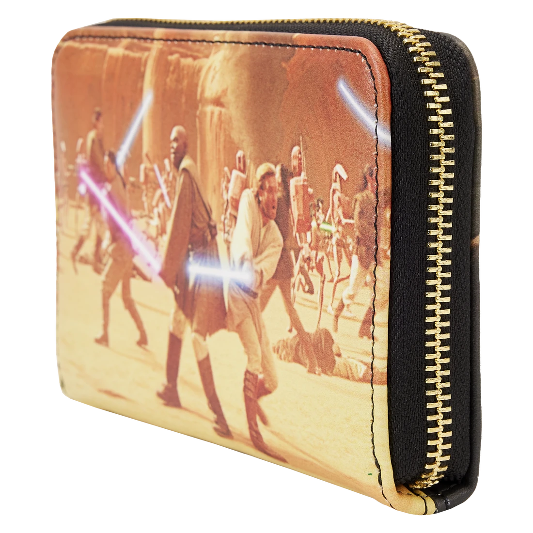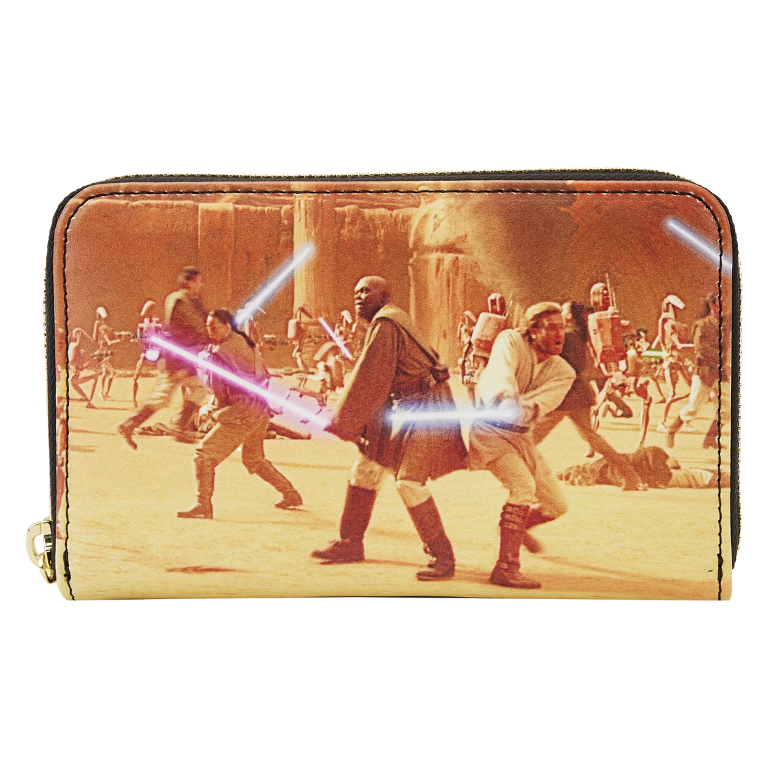 The Loungefly Star Wars: Episode II – Attack of the Clones Scene Zip Around Wallet is made of vegan leather (polyurethane). Wallet zips closed with sturdy metal hardware and features printed details. Take note of the coordinating inside lining.
