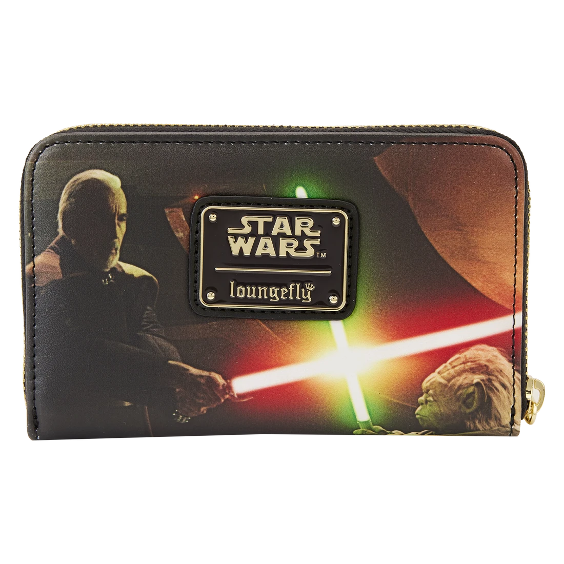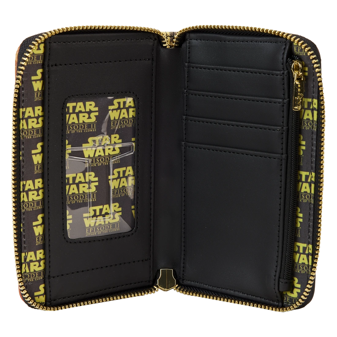Test the limits of what it means to be a Jedi. The Loungefly Star Wars: Episode II – Attack of the Clones Scene Zip Around Wallet features cinematic moments from the legendary middle chapter of the prequel trilogy. On the front, Obi-Wan Kenobi™ and Mace Windu™ face off against an attack. On the back, Count Dooku™ battles Master Yoda™. With four slots for holding cards and a clear slot to hold ID, this galactic accessory is the perfect addition to any Star Wars™ collection.