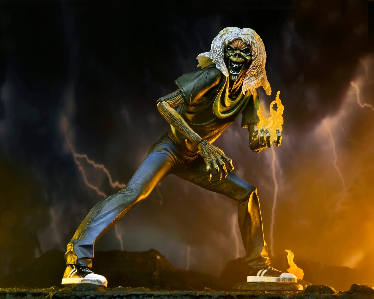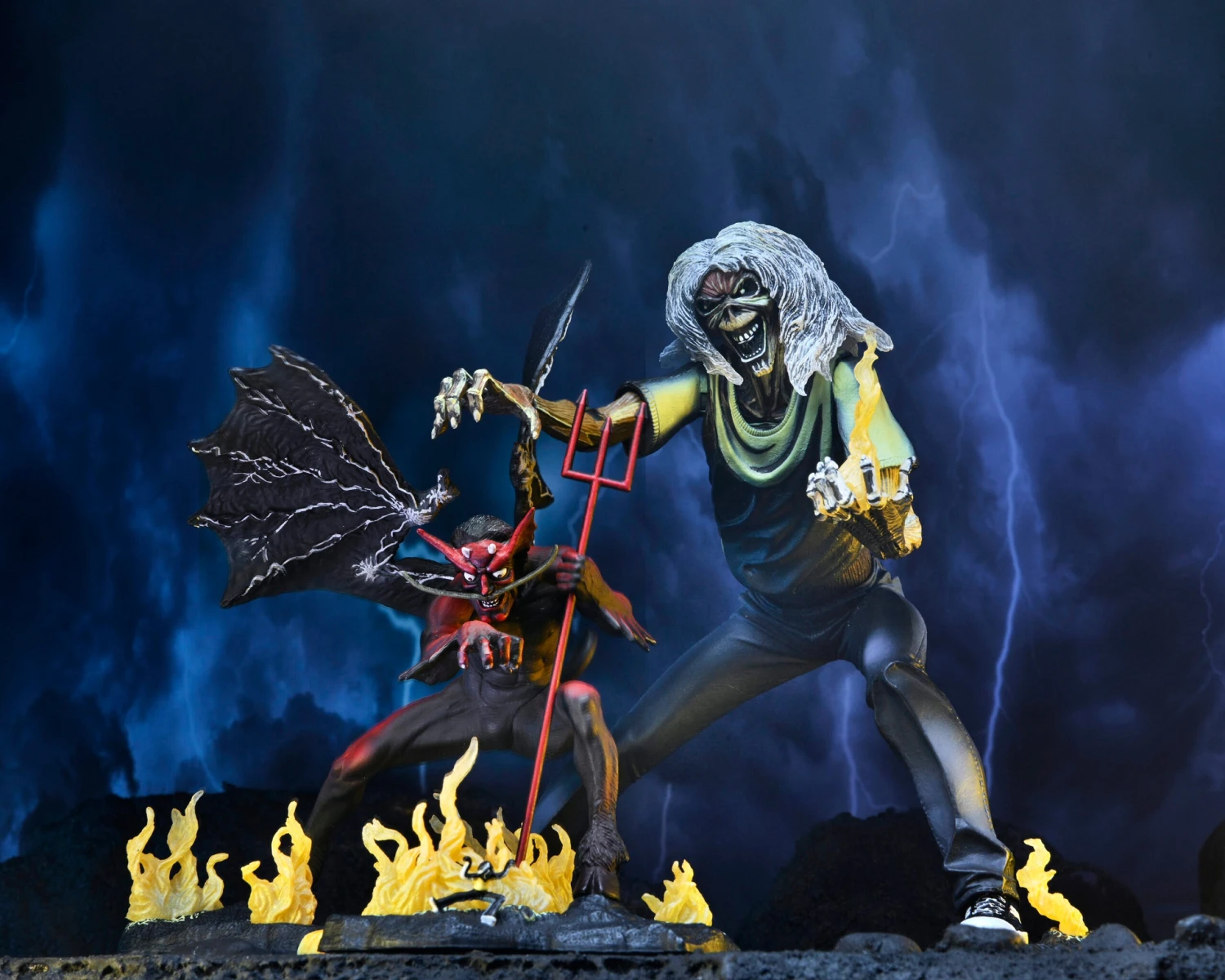Eddie features stunning detail in paint and sculpt that really recreates the illustrations, and is puppeteering the devil himself, who has his own even smaller Eddie puppet. The set also includes a Satan’s head accessory to recreate the cover art for “The Number of the Beast” single cover. Comes in special 40th anniversary 5-panel packaging with opening front flap.