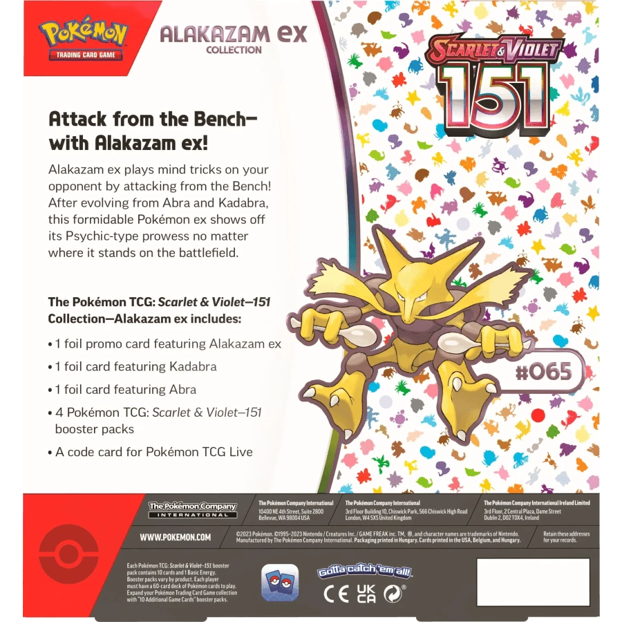 Includes four Scarlet & Violet—151 booster packs, one double rare card featuring Alakazam ex and two foil promo cards featuring Kadabra and Abra