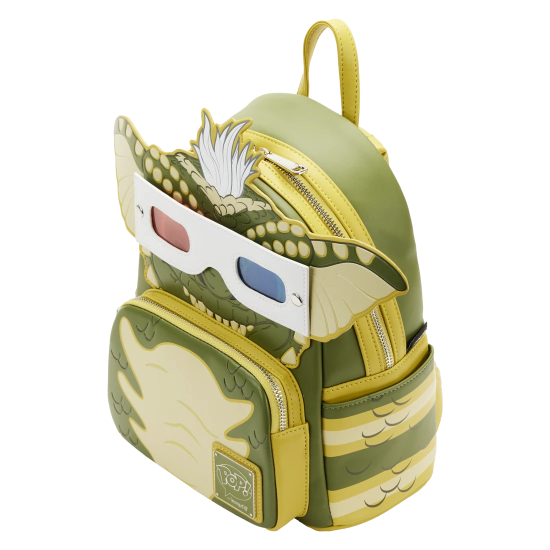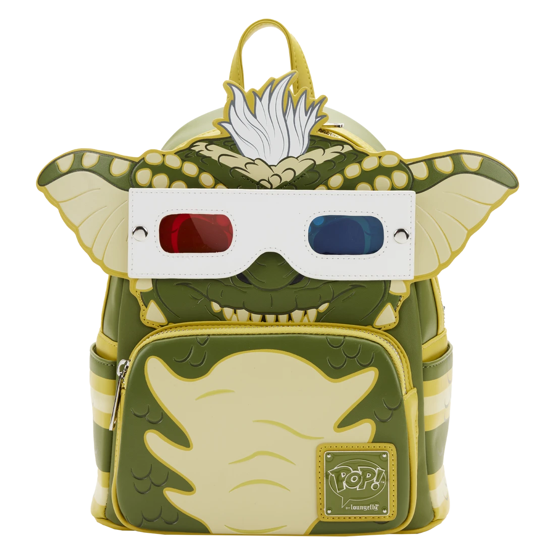 There’s plenty of room in this backpack for stashing Stripe’s favourite candies—or for packing just what you need for a day trip. On the front of this backpack, Stripe comes to life in applique detail, his head and ears sticking over the top, with his characteristic shock of white hair spilling over. In fact, his face peeks out over a front zipped compartment, and the features of his debossed scales carry through on the side pockets. His 3D movie glasses snap on and off the backpack, and in the dark, the lighter yellow areas on his face and body glow! It’s the perfect accessory for tearing through Kingston Falls—or for turning everyday outings into mischievous fun.