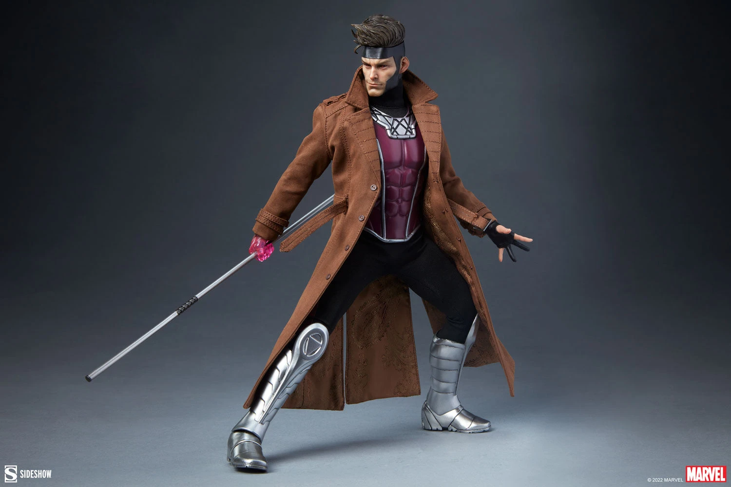 Inspired by his 90s era classic costume, the Gambit Deluxe Sixth Scale Figure features a detailed, cowled headsculpt based on Remy LeBeau’s comic book appearance, complete with swappable short hair and long hair sculpts for differing display options. His costume includes a black fabric body suit with magenta squares on the sleeves and legs, and his signature style is completed with a carefully tailored brown trench coat. Gambit also wears sculpted upper body armor and silver armored boots, bringing his ragin’ Cajun style off the page and onto your shelf.