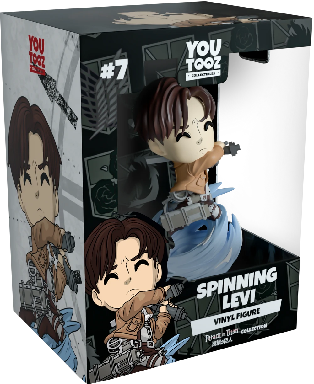 Levi bursts into action, spinning through a gust of swirling blue and white air at 4.5” tall. His body twists backward with a knee raised high, while his swords are lifted over his left shoulder preparing to viciously slice his enemies to shreds. His face looks forward stoically with pursed lips from under a long dark brown undercut. He wears the standard issue Survey Corps uniform with a white cravat popping out from the collar and grey ODM gear.